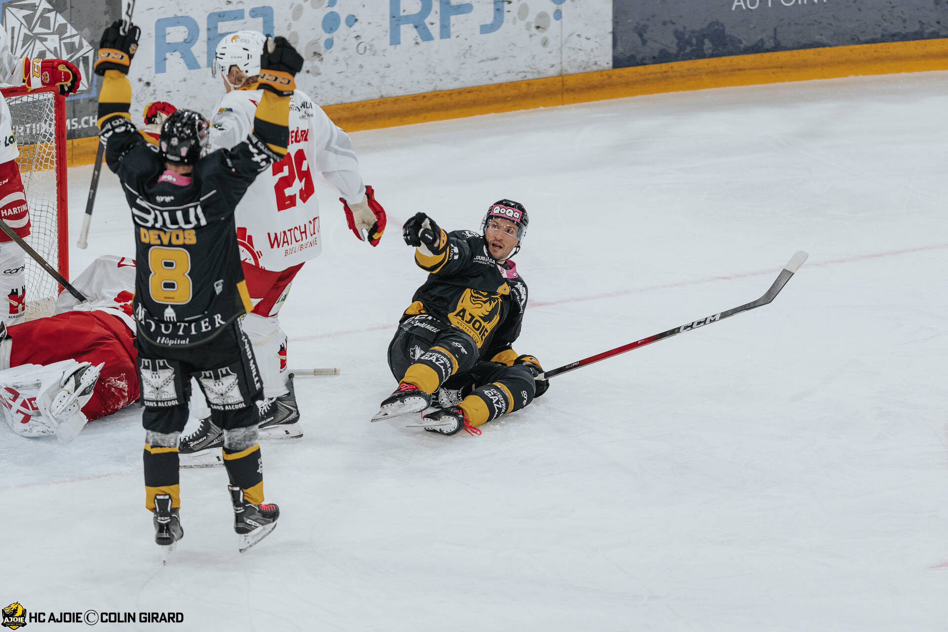 - 4 Hazen Jonathan, 8 Devos Philip-Michaël, But, C.G Photographie, Club National League, Colin Girard, HC Ajoie, HCA, HCA Vs EHCB, NL, National League, RAIFFEISEN ARENA, Saison 2025-26, Saison25-26, célébration, hockey